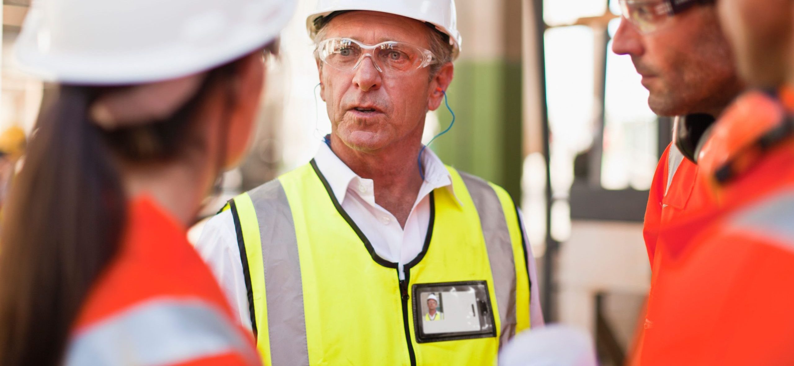 Two workers wearing hard hats featuring the McLoughlin Industrial Flooring logo