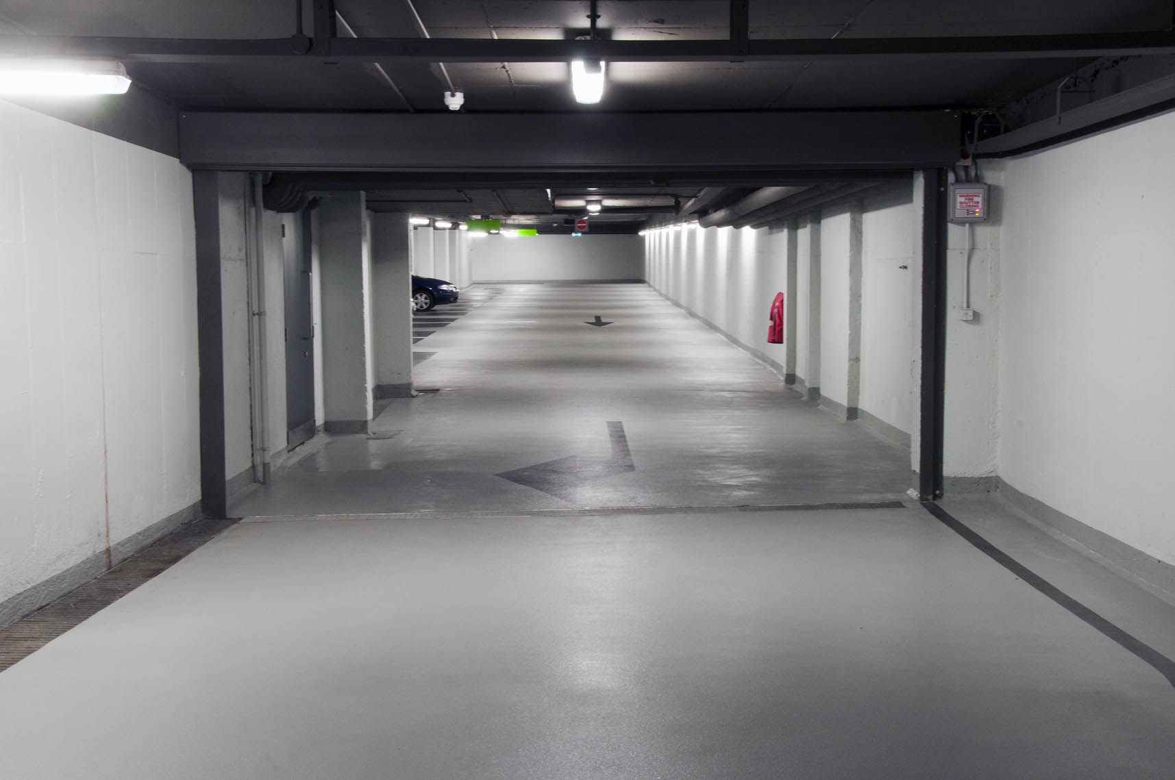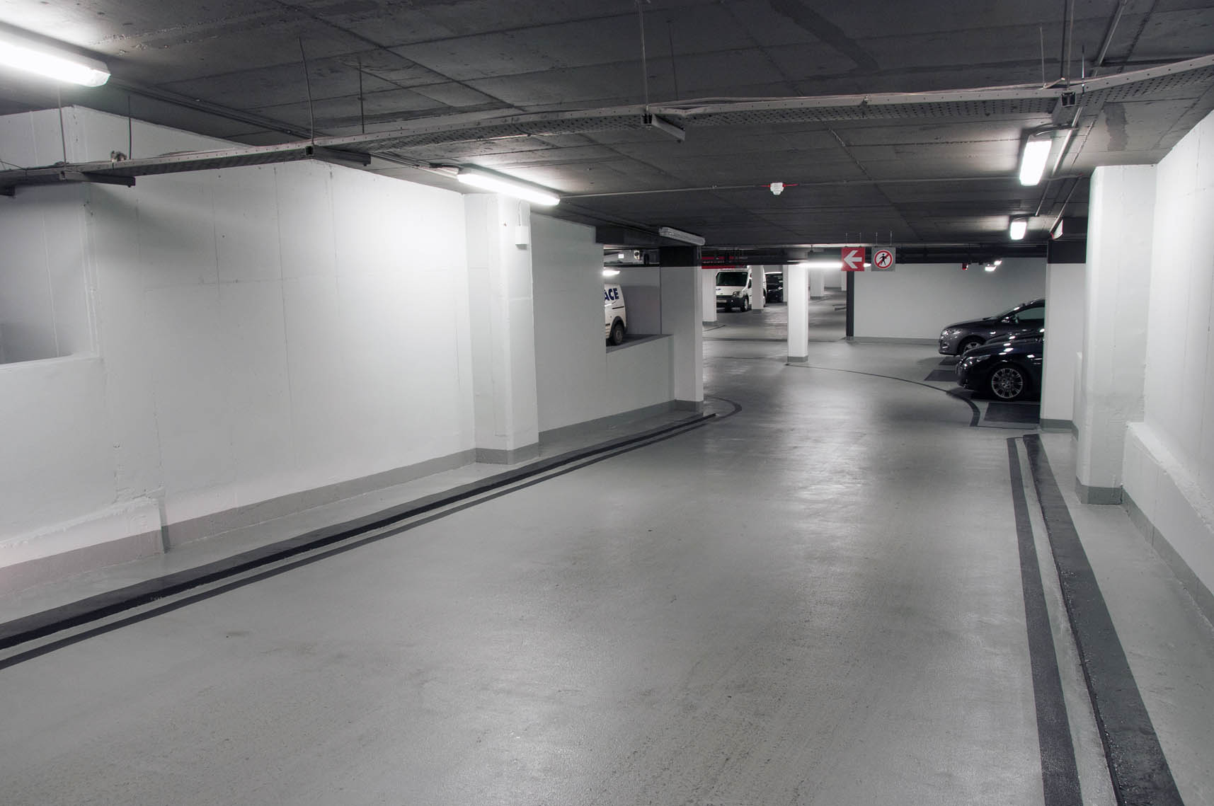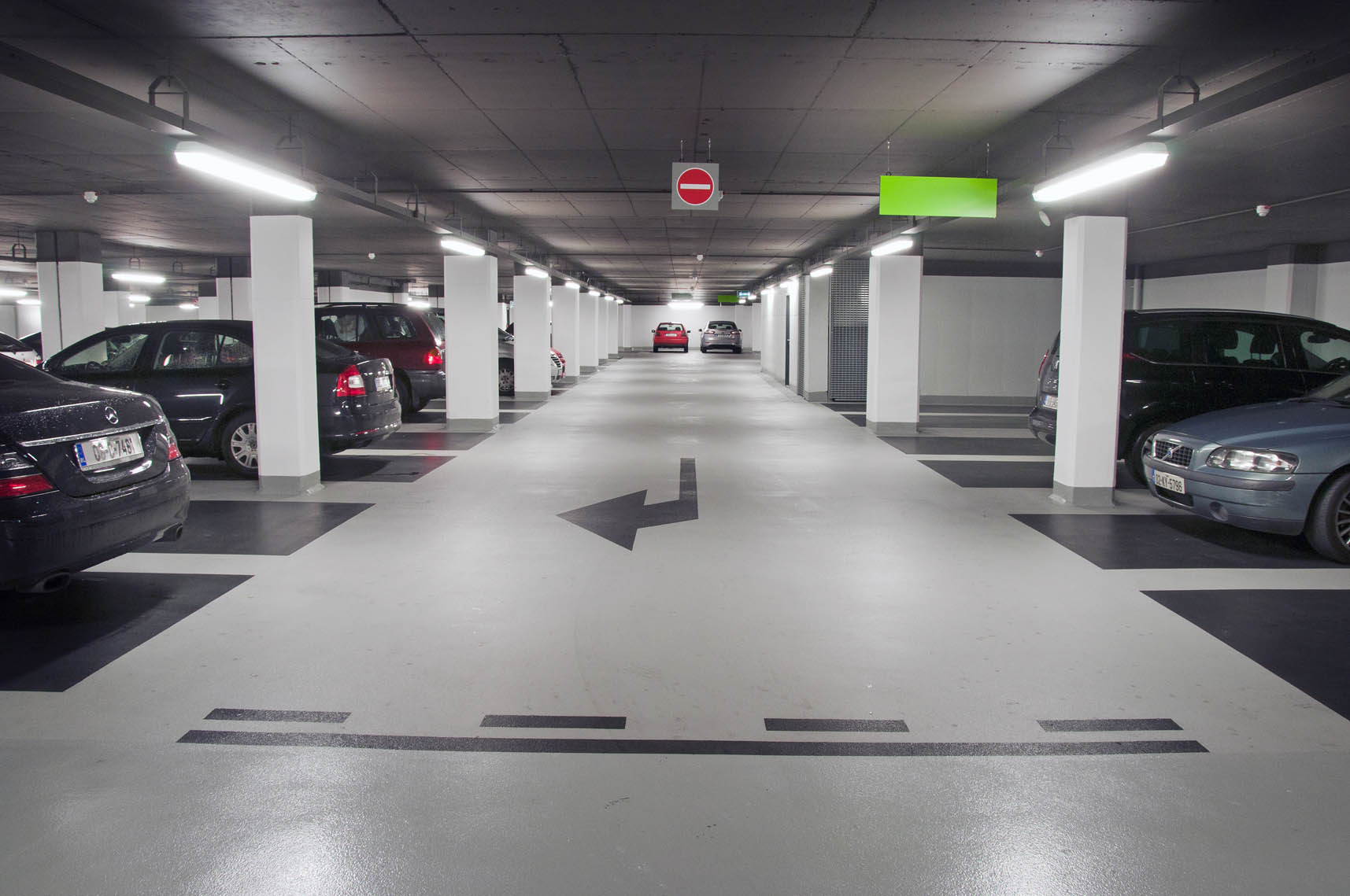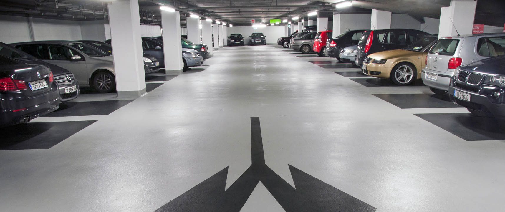 As part of this exciting project, an old underground concrete structure was transformed into a bright, modern parking facility in the centre of Dublin. Following multiple concrete repair works and crack injection repairs, McLoughlin Flooring applied an anti-carbonation coating to walls, columns and soffit. Due to the poor state of the old existing concrete substrate, a 5mm epoxy build up was required to provide a high quality, slip resistant floor finish.