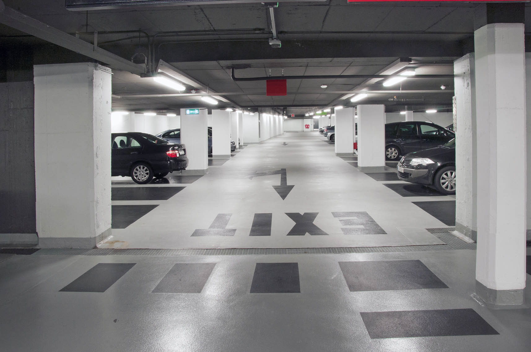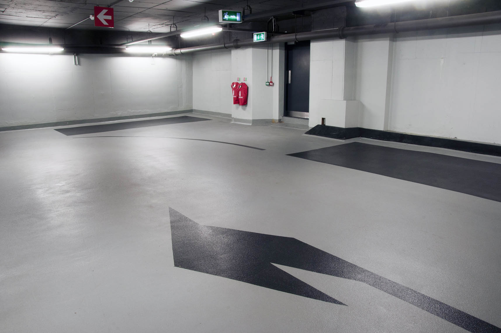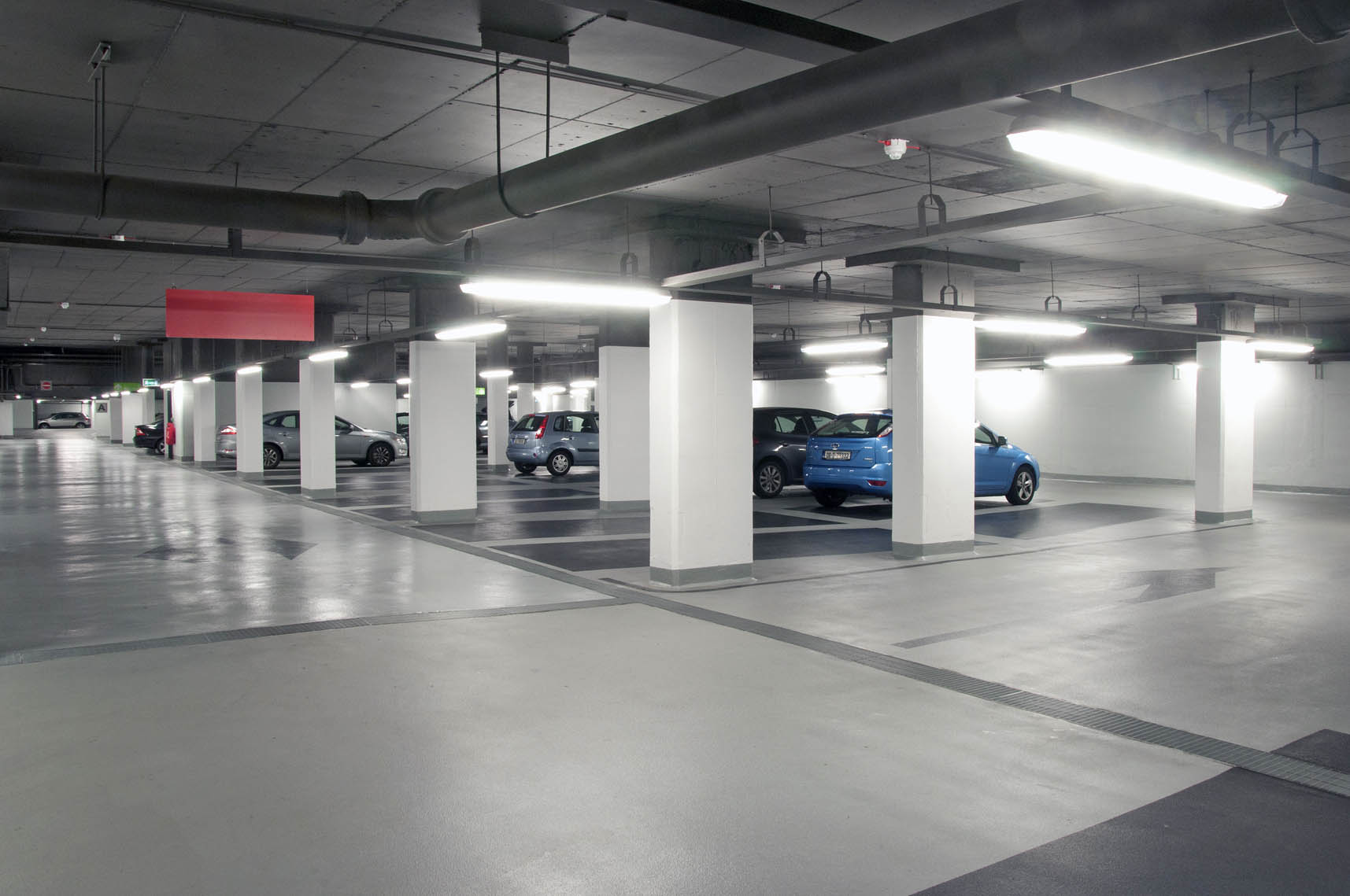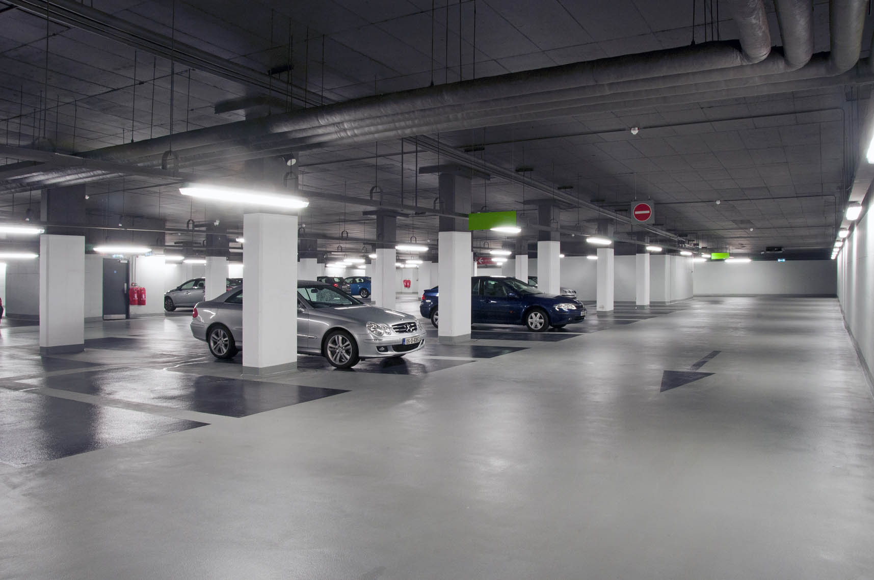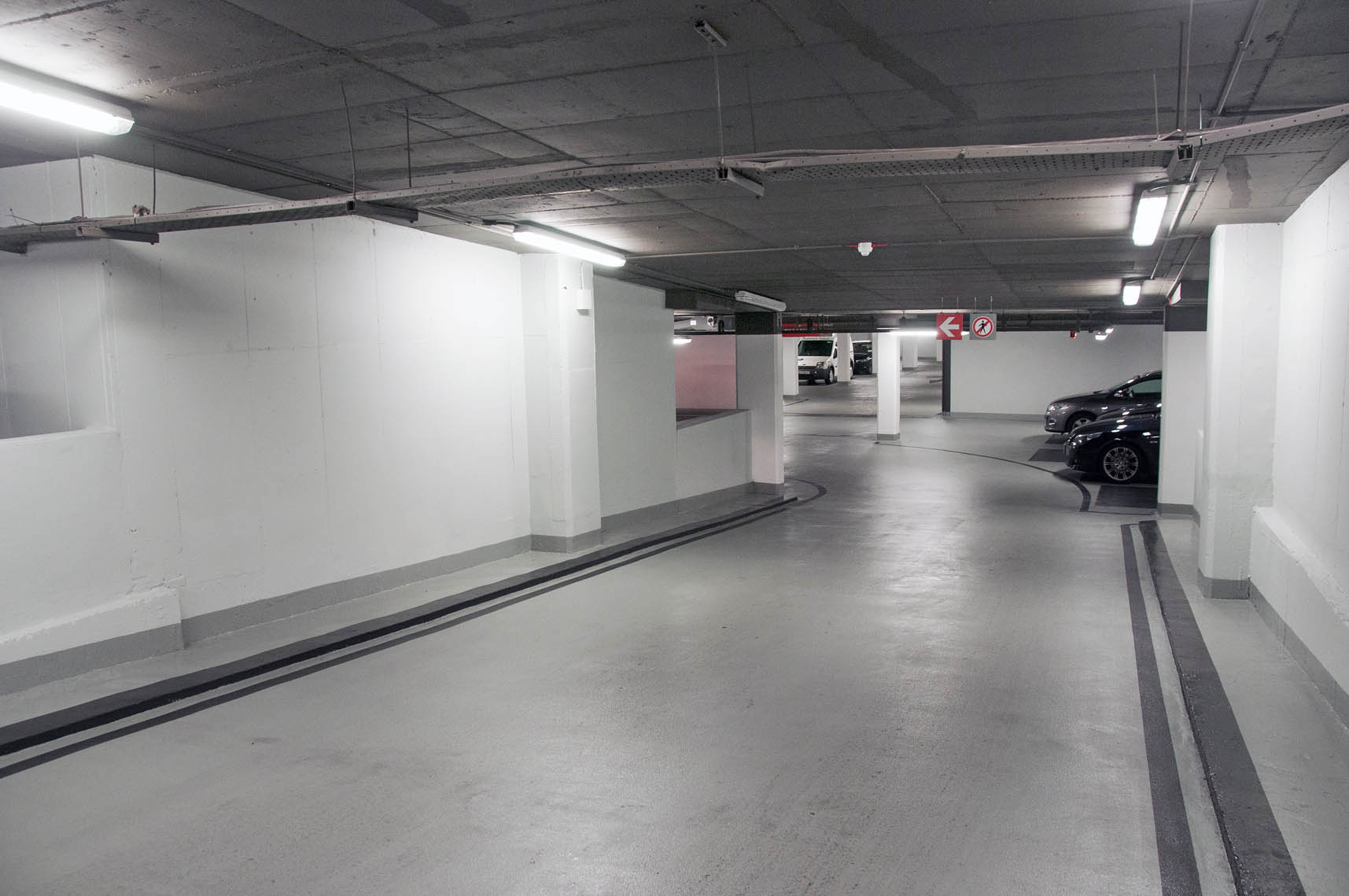 As part of this exciting project, an old underground concrete structure was transformed into a bright, modern parking facility in the centre of Dublin. Following multiple concrete repair works and crack injection repairs, McLoughlin Flooring applied an anti-carbonation coating to walls, columns and soffit. Due to the poor state of the old existing concrete substrate, a 5mm epoxy build up was required to provide a high quality, slip resistant floor finish.